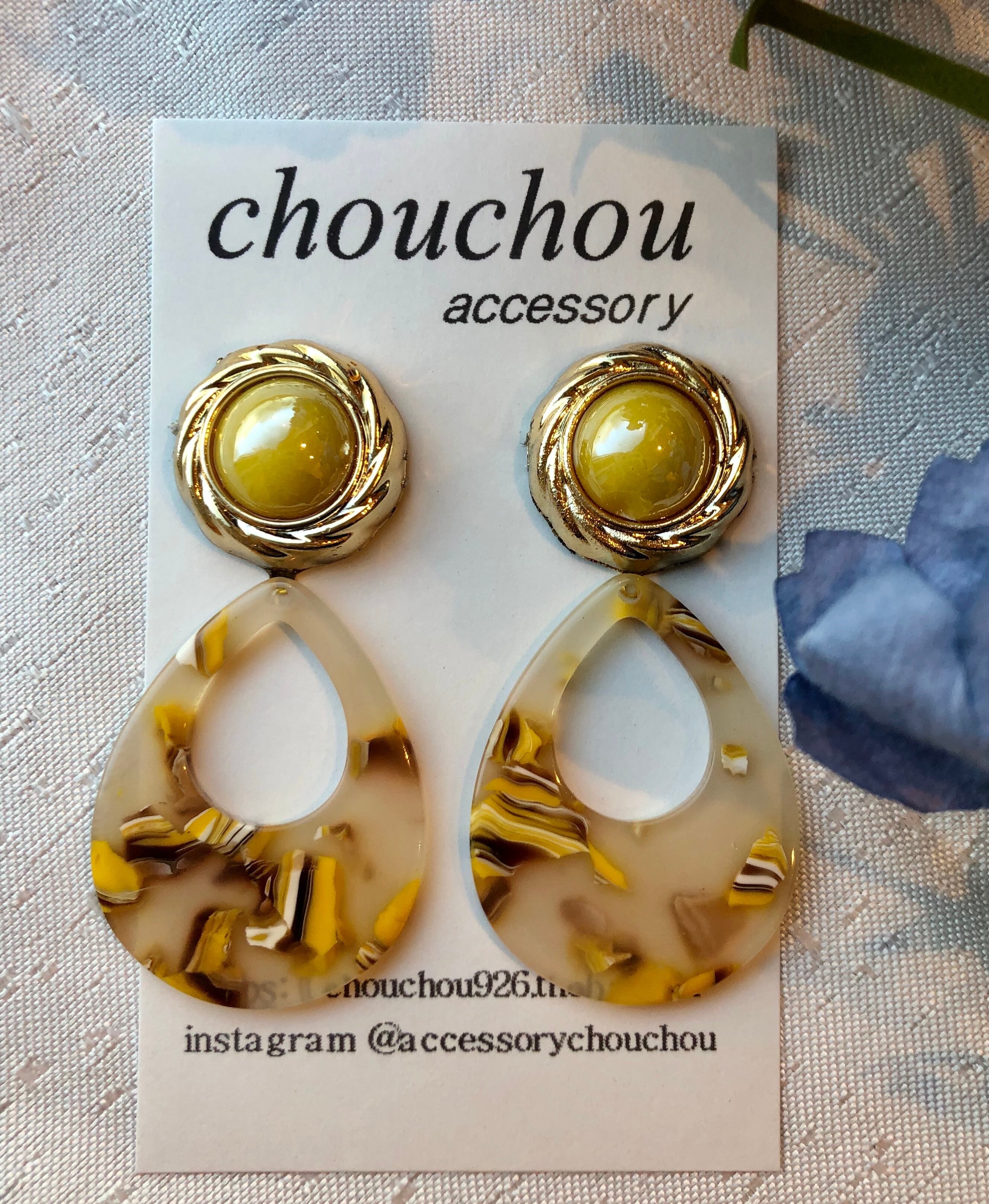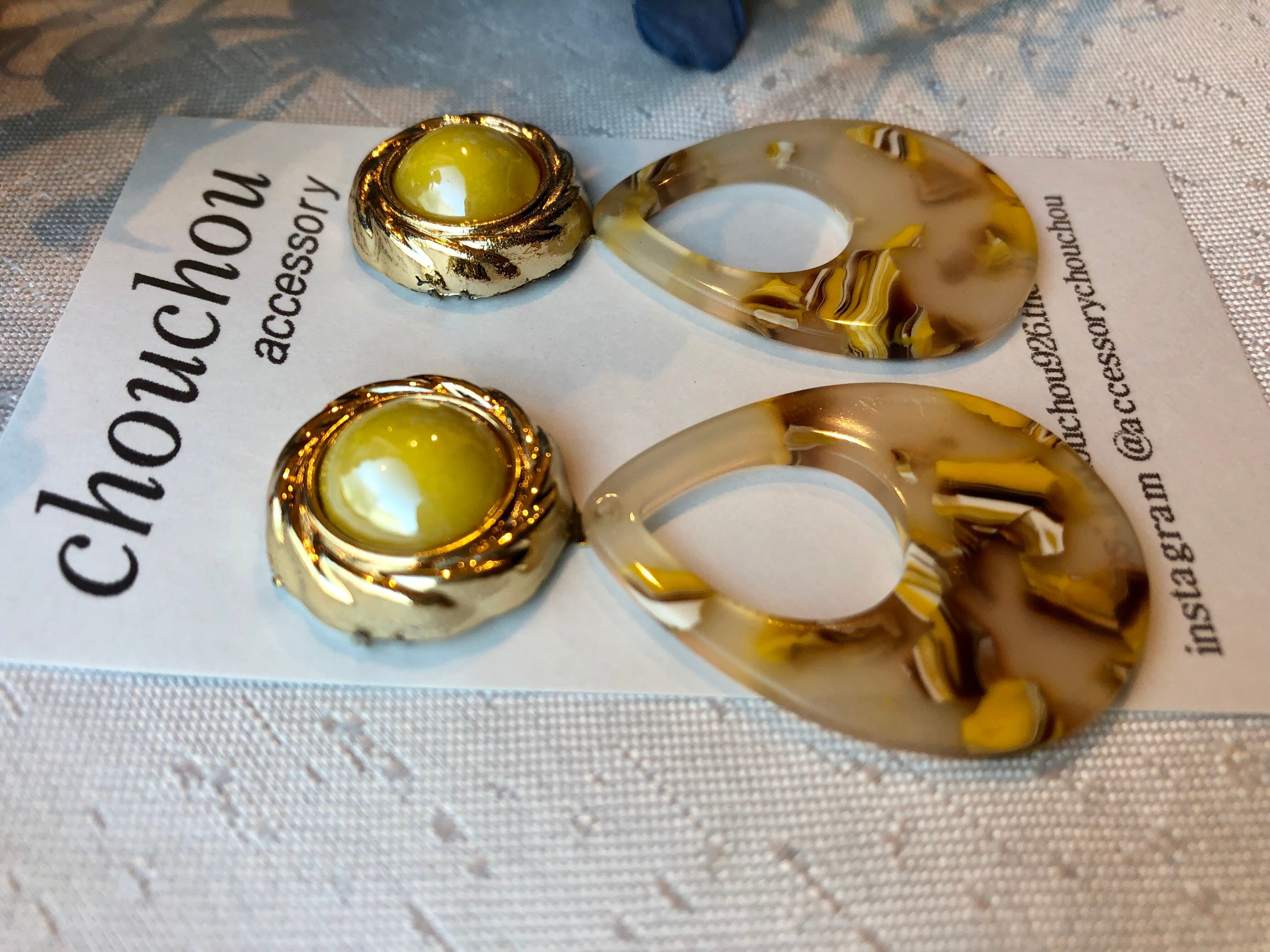 ▼黄色 ベージュアクリル マーブル×イエローカボション ピアスorイヤリング(イヤリング変更無料)