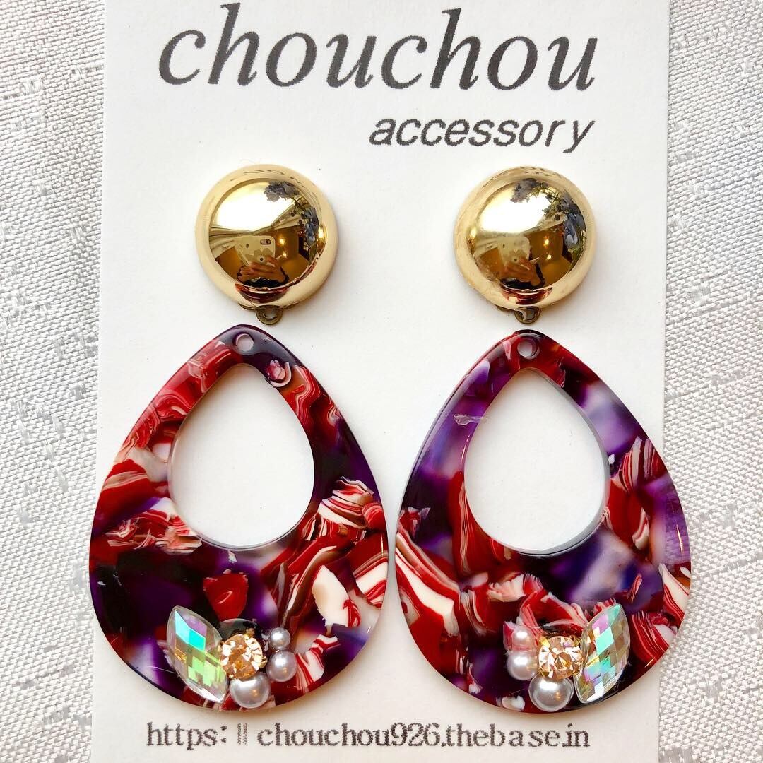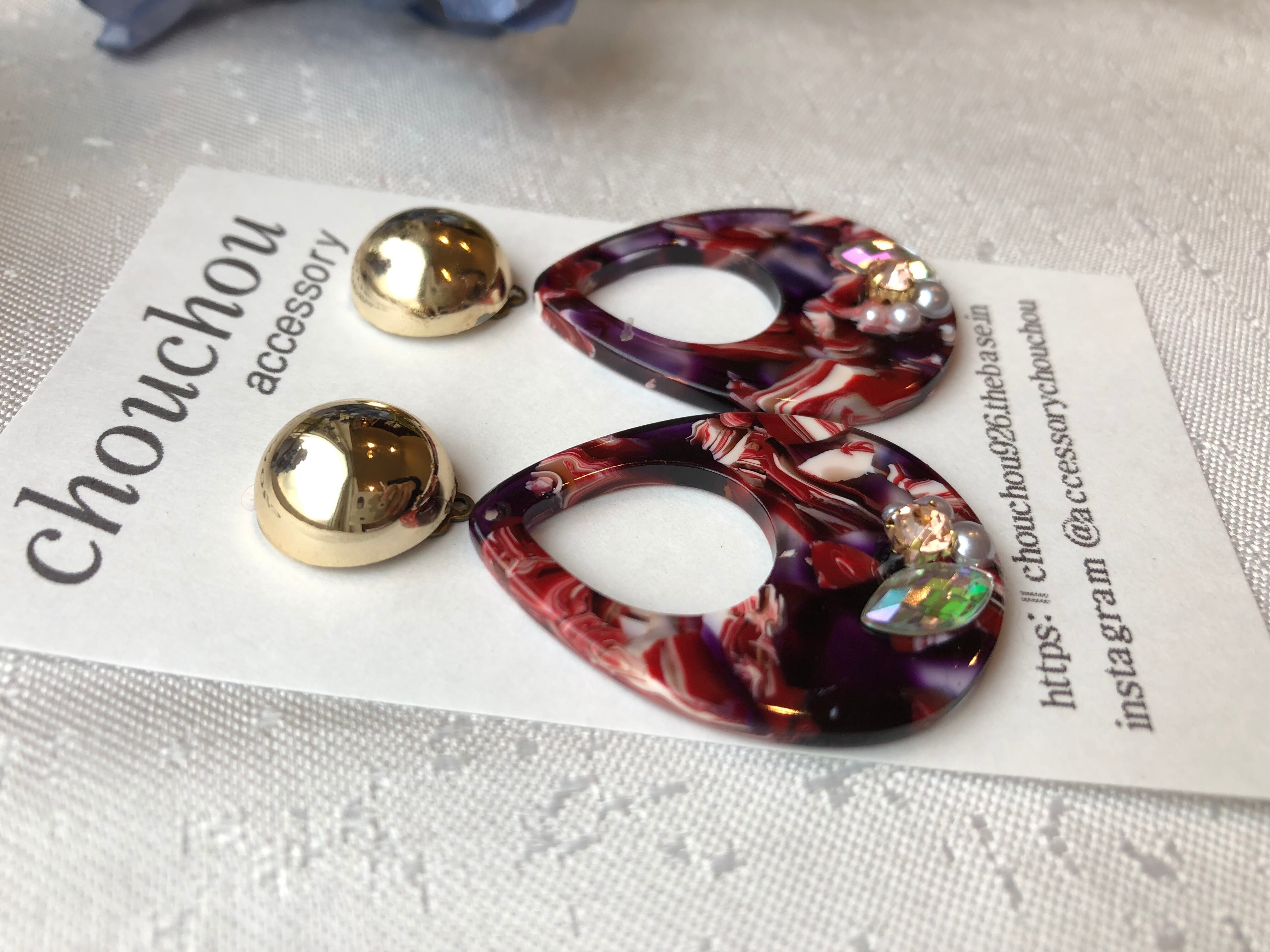 ▼赤 アクリル マーブル×ビジュー×ゴールドカボション ピアスorイヤリング