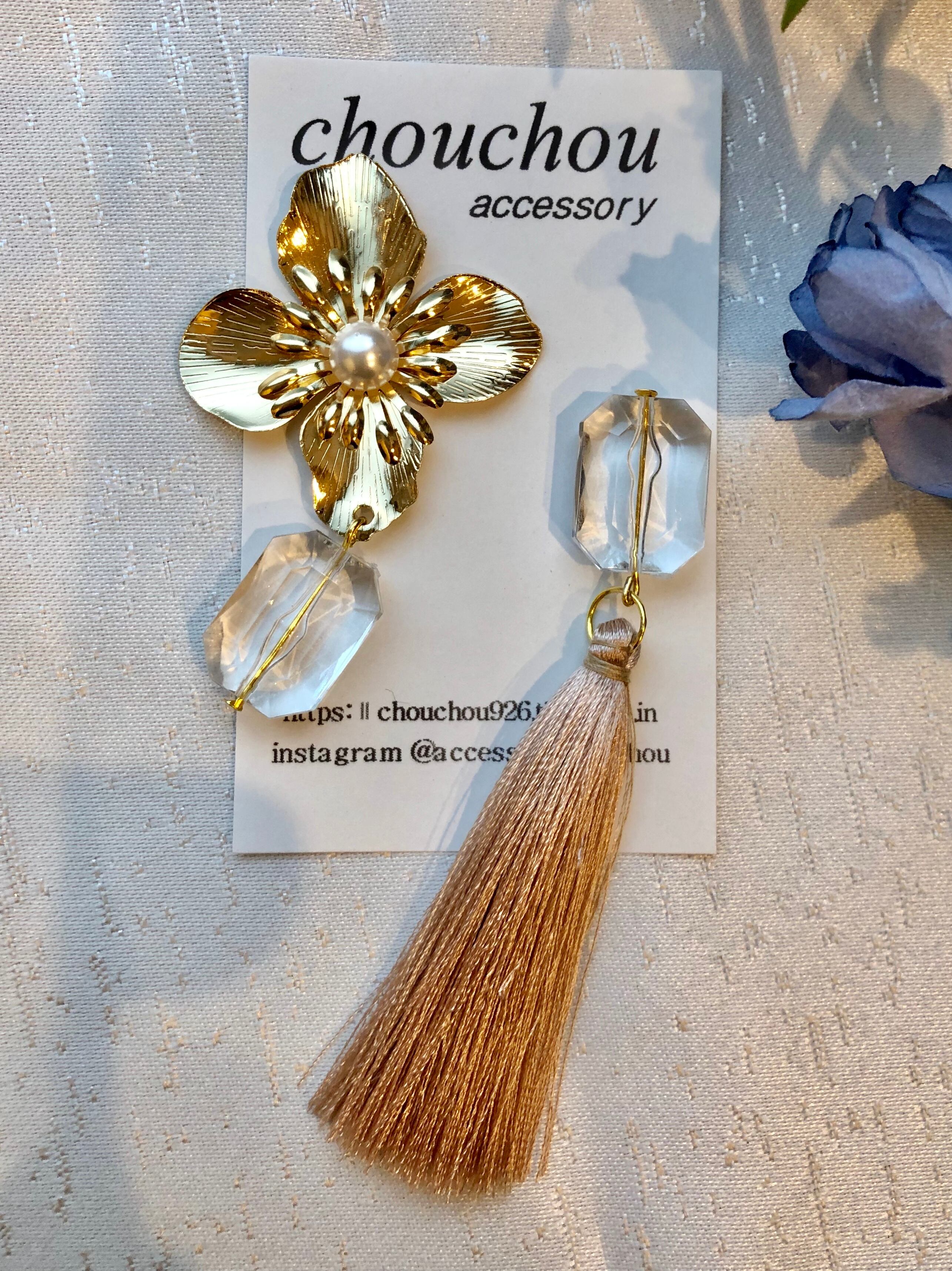 【イヤリング無料】アシンメトリー ゴールドフラワー×ベージュタッセル クリアビーズ ピアス