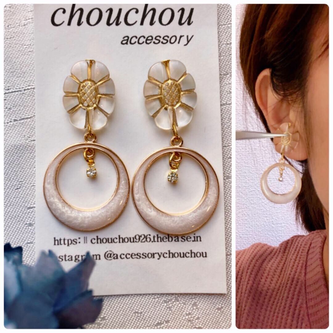【イヤリング無料】ラスト1点▼フラワー クリアビーズ×ホワイト リング ビジュー 春ピアス