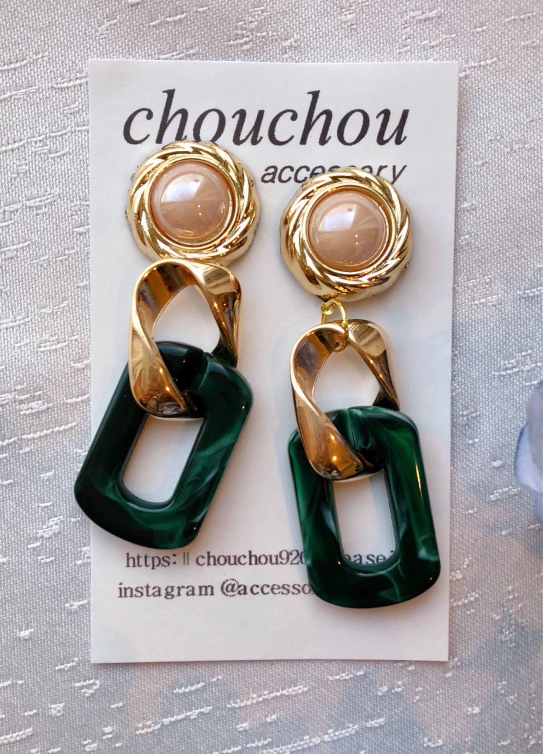 【イヤリング無料】ライトベージュ×ゴールドチェーン×マーブルグリーン ピアス